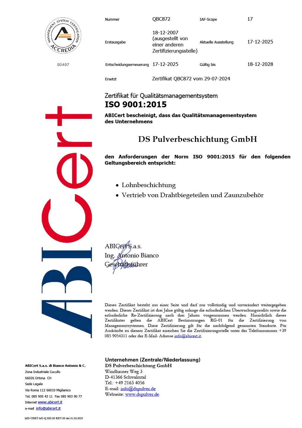 Die DS Pulverbeschichtung GmbH ist seit dem 20. Dezember 2007 ISO 9001 zertifiziert. Die Zertifizierung erfolgte durch den externen Auditor QUACERT, Gesellschaft zur Zertifizierung von Qualitätsmangementsystemen mbH.